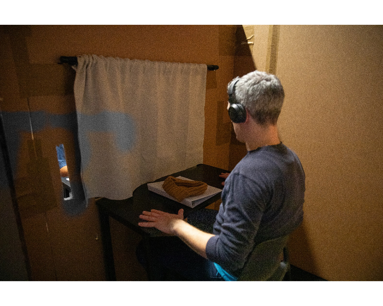 Bridging Conversations was a sound-mediated experience for two that offered participants a brief yet impactful opportunity to immerse themselves in someone else’s perspective. The vision for this immersive experience was to foster empathy by inviting participants to step into the shoes of another individual and discover unanticipated connections during an encounter that transcends differences. Participants entered a private enclosed cardboard environment, put on headphones, received guidance on how to take on a persona, took a seat across one another and engaged in a playful yet confrontational simulated dialogue with a person who held contrasting views on life.